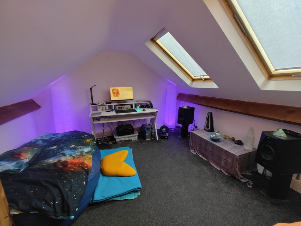 My treatment room in Gloucestershire, UK is the in-person side of my work. It’s a space for self-regulation, exploration, and direct experience with advanced wellbeing tech. Here you’ll find three bioresonance systems, brain and nervous system tools, and practices like sound healing and breathwork. Sessions combine this equipment with my own background in meditation, somatic therapy, and conscious conversation, helping you release tension, reset your system, and reconnect with yourself. Every session is unique, guided by what you need in the moment, and most people find the effects cumulative, which is why I usually recommend booking a block of six.